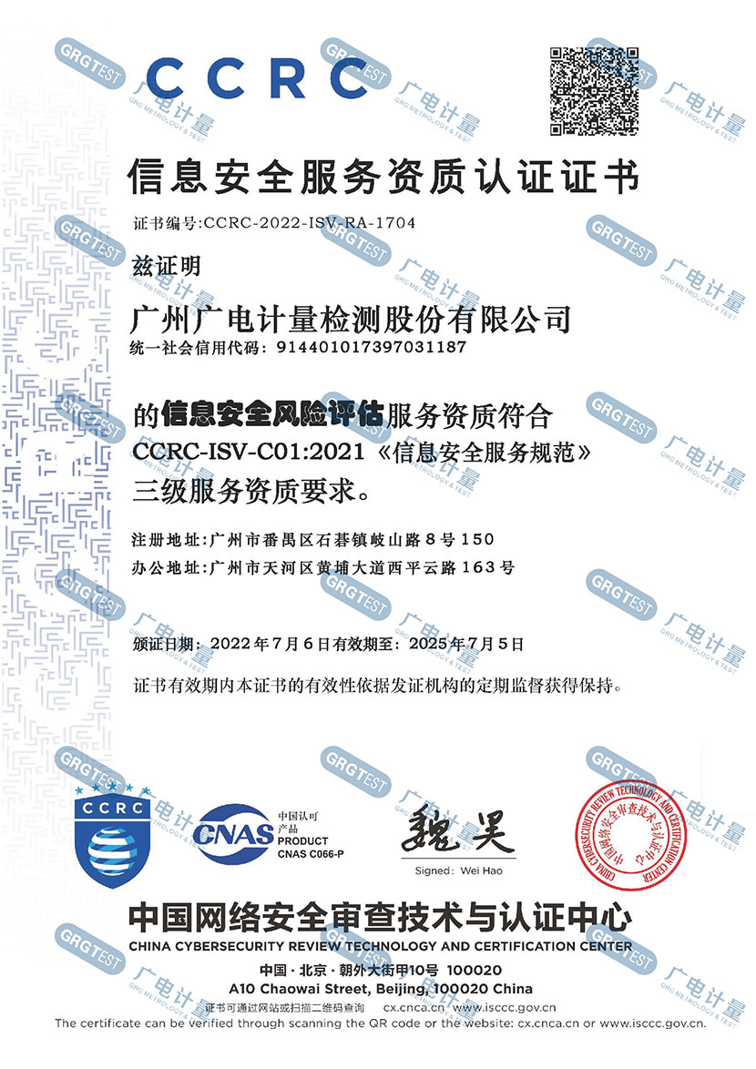 (1)廣電計量獲得中國網(wǎng)絡(luò)安全審查技術(shù)與認(rèn)證中心(CCRC)頒發(fā)的信息安全服務(wù)資質(zhì)認(rèn)證證書;