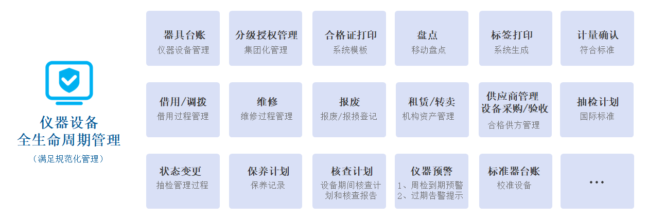 產(chǎn)品概述:實現(xiàn)儀器設備全生命周期管理,符合國家CNAS/17025管理要求,使儀器設備在計量管理方面進行符合計量規(guī)范、科學化管理,最大化發(fā)揮設備的價值,提高儀器設備的經(jīng)濟效益和使用效率。
