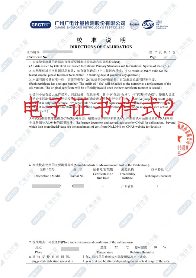 此版式證書為我司認可的正式證書,每份證書將對應唯一的編號溯源防偽,紙質證書可使用手機掃描證書封面二維碼核對封面信息辨別真偽。我司電子版證書下載渠道為 “廣電計量客戶自助服務平臺(http://120.197.59.40:8086/)”或“企業計量儀器信息管理系統(單機版)”。