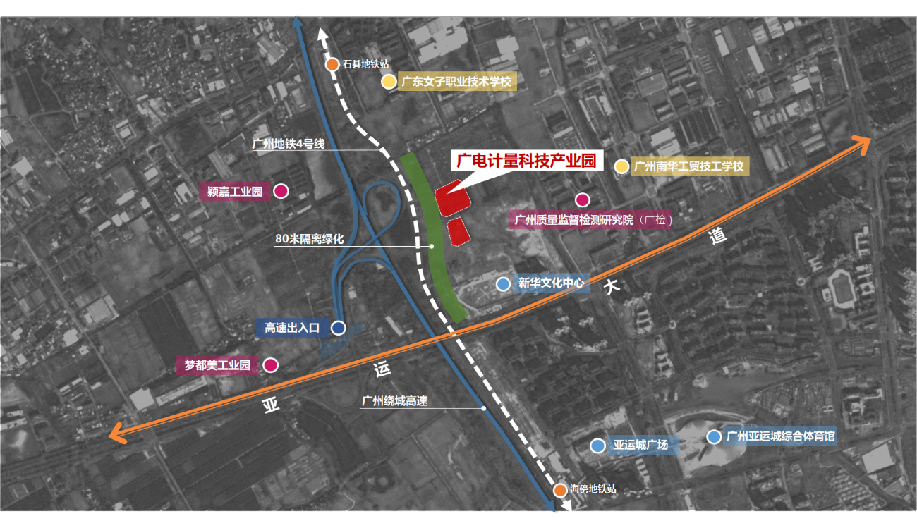 廣電計量科技產業園是由廣電計量檢測集團股份有限公司投資興建的全球總部基地,位于廣州市番禺區專精特新企業集聚區,已入駐多家高新技術企業;毗鄰新華里文化綜合體,南側為亞運城小區,周邊生活配套完善;處于亞運大道北側,西臨廣州繞城高速,靠近廣州南站及蓮花山港等海陸交通樞紐,交通十分便捷。