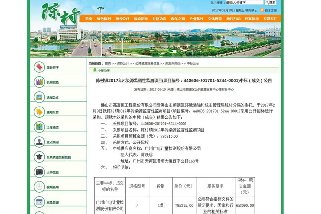 2月10日,廣電計量憑借商務技術得分的明顯優勢,以總分第一的成績成功中標佛山市順德區陳村鎮2017年污染源監督性監測項目,這也是廣電計量2017年在環境檢測領域的新春第一標。中標合同順利簽訂后,廣電計量將為順德區陳村鎮的污染源監督性監測提供科學公正的數據和專業的技術服務保障。
