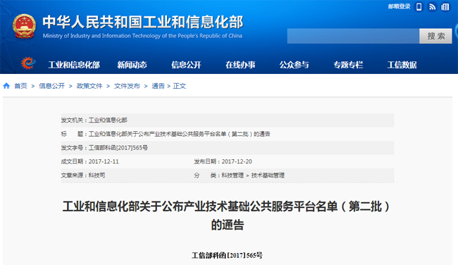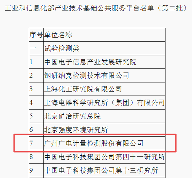 2017年12月20日,依據(jù)《工業(yè)和信息化部辦公廳關(guān)于做好2017年產(chǎn)業(yè)技術(shù)基礎(chǔ)公共服務(wù)平臺(tái)申報(bào)工作的通知》(工信廳科函〔2017〕369號(hào)),經(jīng)評(píng)審和公示,確定廣電計(jì)量等17家單位列入工業(yè)和信息化部產(chǎn)業(yè)技術(shù)基礎(chǔ)公共服務(wù)平臺(tái)名單(第二批)。