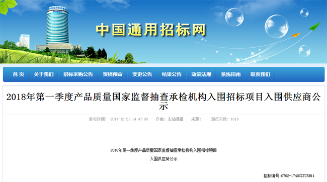 2017年12月21日,方圓廣電檢驗檢測股份有限公司(簡稱“方廣檢測”)列入了“2018年第一季度產品質量國家監督抽查承檢機構入圍招標項目”入圍供應商。