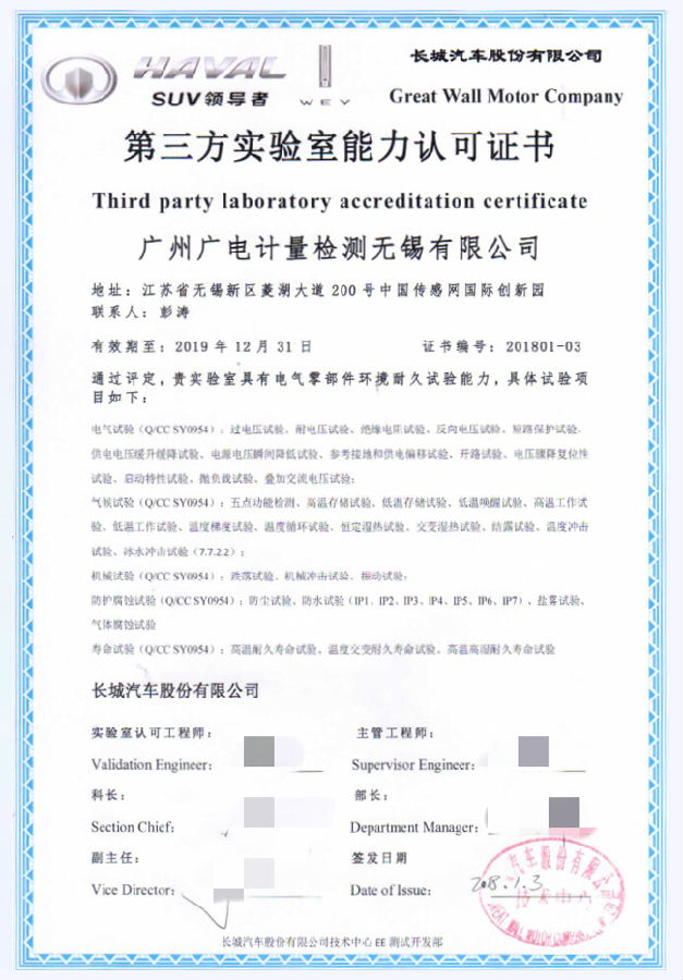 無(wú)錫子公司獲得長(zhǎng)城汽車電氣零部件環(huán)境耐久試驗(yàn)授權(quán)認(rèn)可