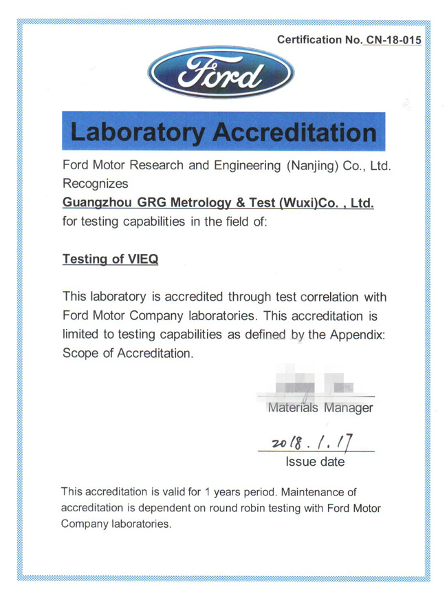 無(wú)錫子公司獲得福特汽車第三方實(shí)驗(yàn)室VOC認(rèn)可