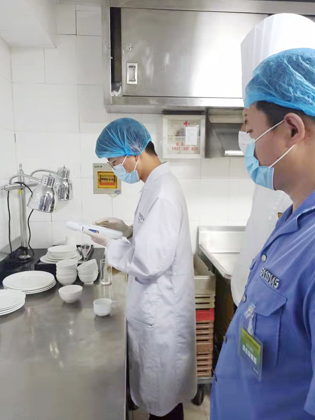 9月初,西安廣電計量接到西安市新城區市場監督管理局委托任務,為“十四運”接待酒店進行專項食品安全保障。9月8日起,西安食品農產品檢測實驗室派出技術人員進駐酒店,負責對酒店食品原材料、餐具、人員衛生等進行現場快檢,涵蓋蔬菜、水果、鮮食用菌、水產品、食用油、熟食成品、盒飯、工器具、餐飲具、操作間人員手部、餐廳紫外線燈強度等。