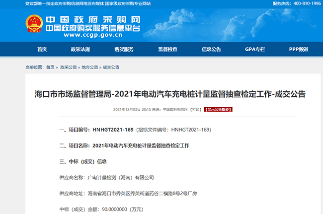 12月3日,海口市市場監督管理局2021年電動汽車充電樁計量監督抽查檢定項目中標結果公布,廣電計量檢測(海南)有限公司(簡稱海南廣電計量)成功中標該項目。這是繼中國計量科學研究院中標首例后,全國第二例由政府進行公開采購的充電樁計量監督抽查檢定項目,充分體現了監管部門對廣電計量的認可,為公司進一步拓展充電樁計量檢測及新能源汽車領域市場奠定了堅實基礎。