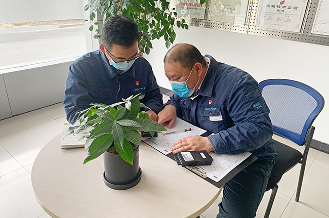 上海子公司黨支部書記、可靠性與環(huán)境試驗實驗室副主任龐威(左)與瞿軍討論疫情防護工作