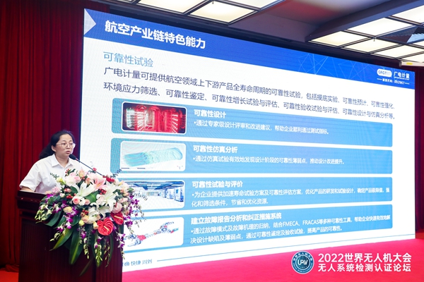 檢測傳遞著產(chǎn)業(yè)鏈上下游及消費者對產(chǎn)品的信心。在無人機蓬勃發(fā)展的今天,計量檢測機構(gòu)為產(chǎn)品質(zhì)量的確認與鞏固提供了重要的技術(shù)基礎(chǔ)。會上,針對無人機檢測市場目前仍處于市場起步階段,企業(yè)對無人機檢測存在著普遍的信息不對稱問題,廣電計量無人裝備及機器人技術(shù)副總監(jiān)張曉瑾博士作主題分享,詳細介紹了無人機行業(yè)所面臨的主要產(chǎn)品質(zhì)量及性能挑戰(zhàn),分析了無人裝備目前的主要檢測需求,并向與會人員分享了廣電計量在無人機檢測領(lǐng)域的八大板塊能力,闡述計量檢測機構(gòu)如何助力無人機產(chǎn)業(yè)高質(zhì)量發(fā)展。