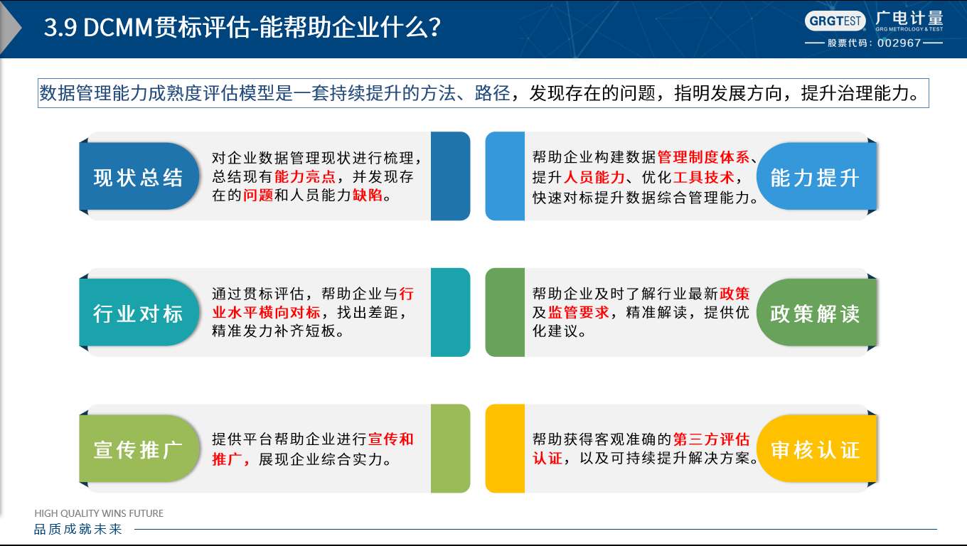 未來,廣電計量將發揮技術服務優勢,繼續支撐工信部、各地工信主管部門、大數據主管部門、政務數據管理部門等單位做好DCMM和數據管理相關工作,助力國家大數據戰略,推動國家大數據治理體系建設的政策落地。