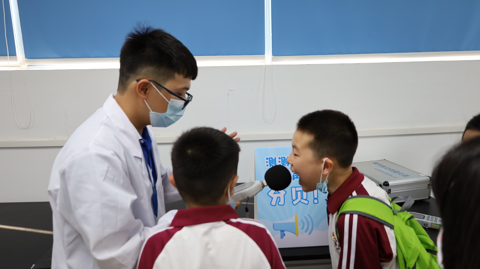 聲音分貝測試環(huán)節(jié),小學生們排隊依次體驗不同強度聲音的分貝數(shù)值