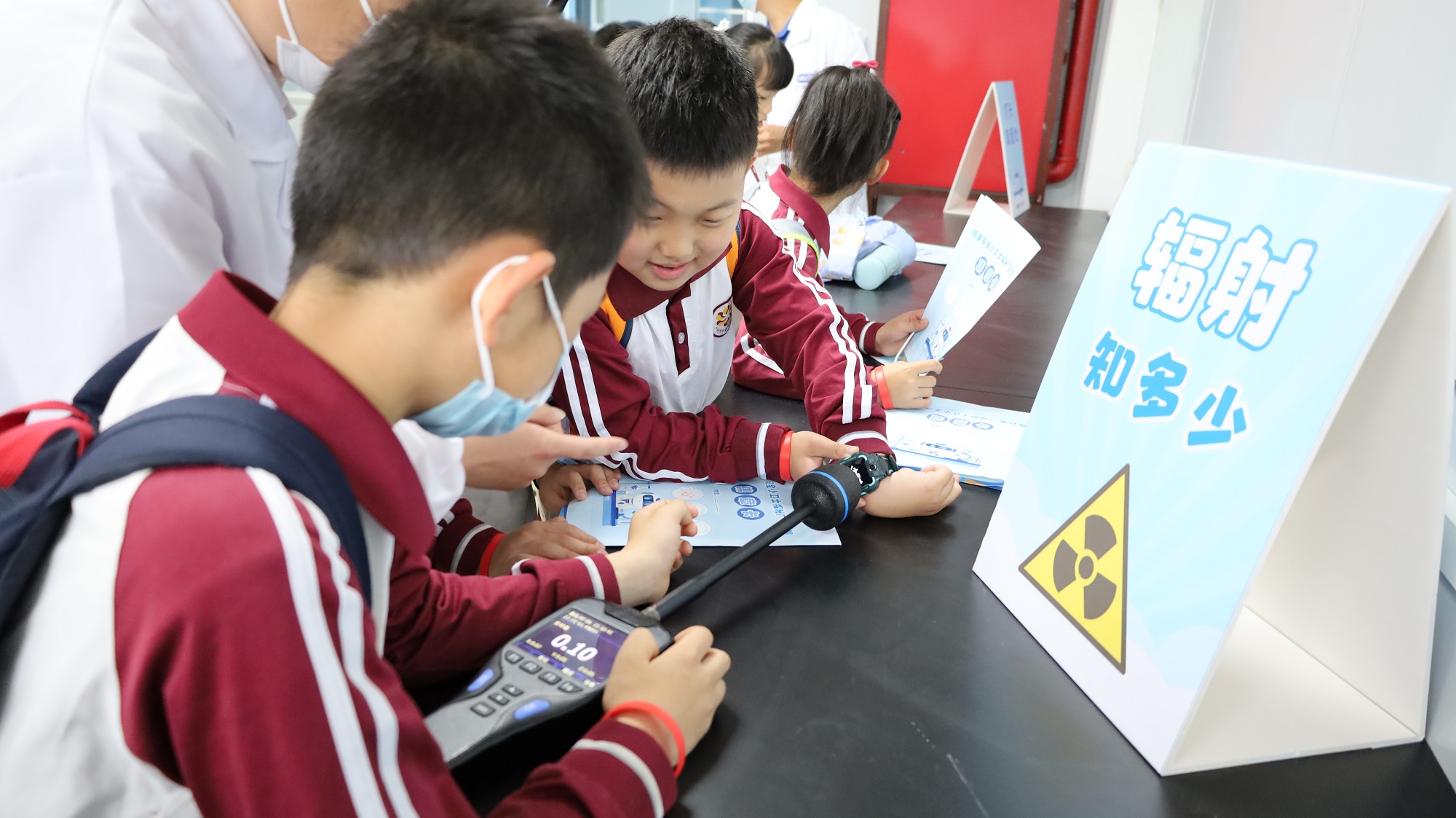 輻射檢測體驗環(huán)節(jié),學生們拿出自己隨身佩戴的電話手表,檢測其使用過程中的輻射值