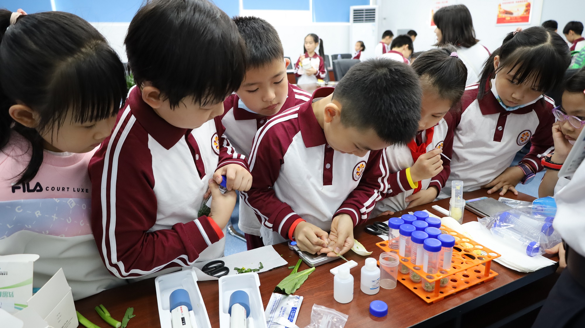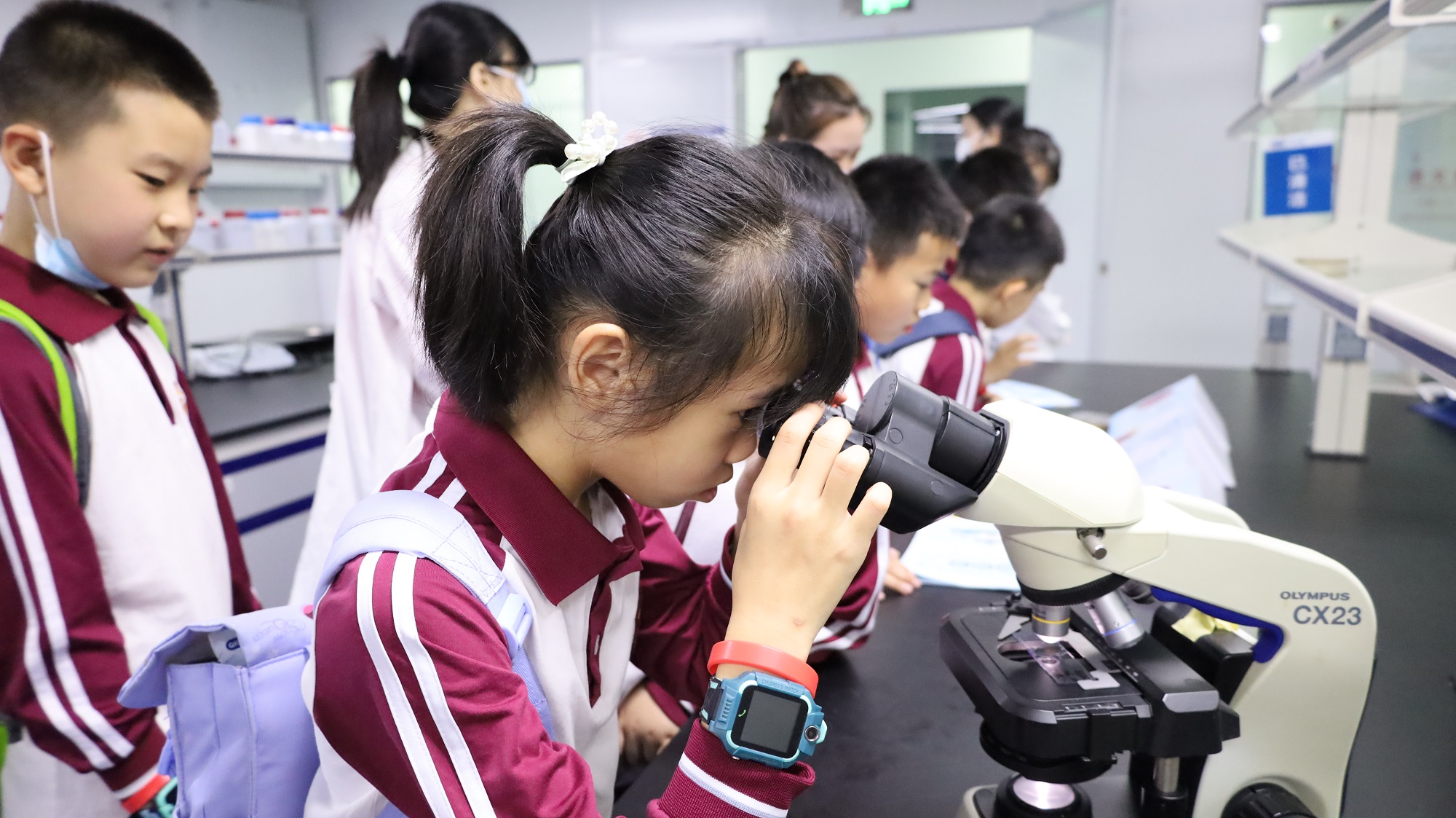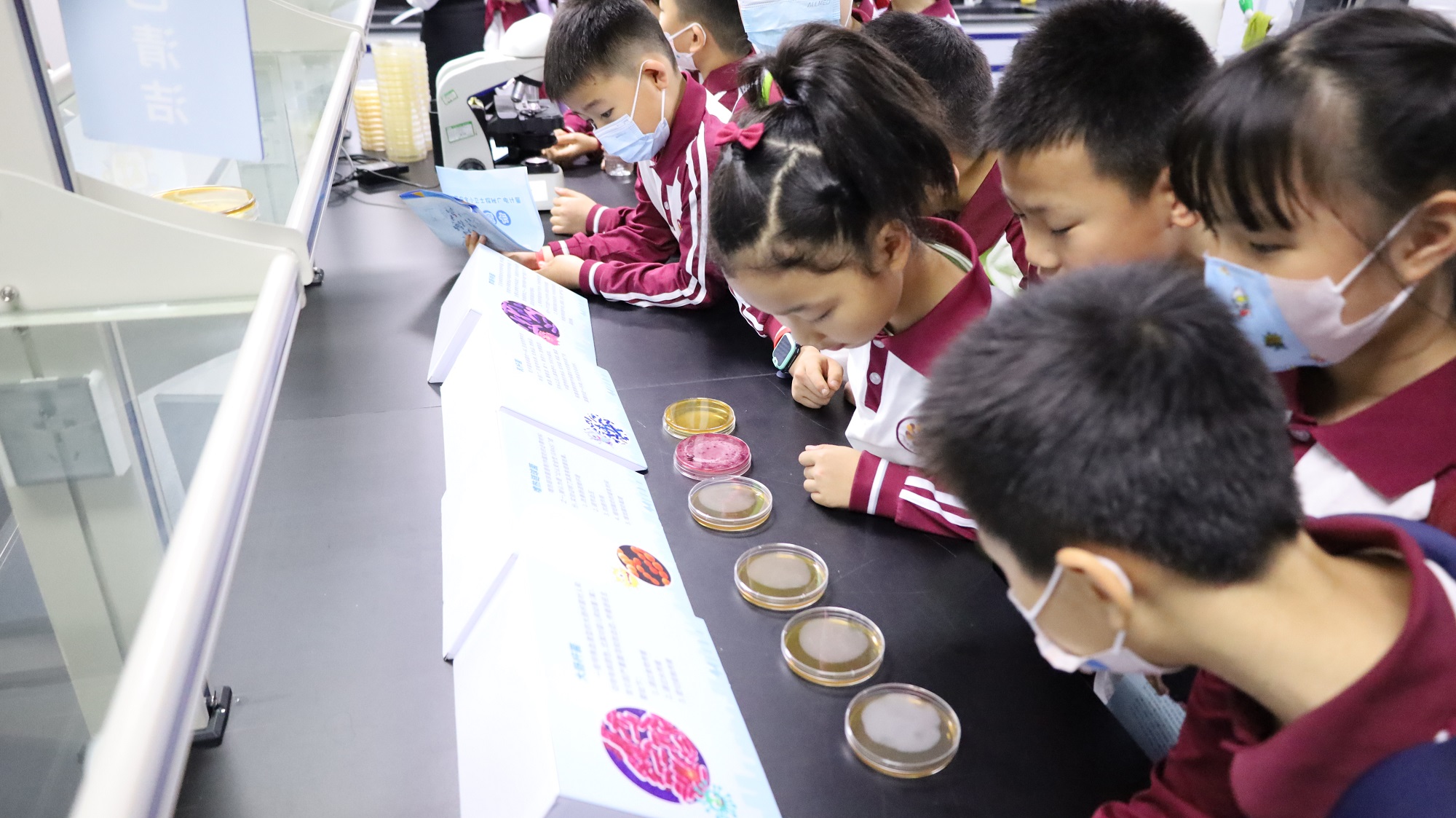 微生物觀測環(huán)節(jié),小學生們認真觀測細菌培養(yǎng)皿,并通過顯微鏡看到細菌的“真面目”