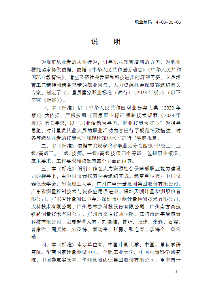 近日,人力資源社會(huì)保障部發(fā)文《人力資源社會(huì)保障部辦公廳關(guān)于頒布勞動(dòng)保障協(xié)理員等25個(gè)國家職業(yè)標(biāo)準(zhǔn)的通知》(人社廳發(fā)[2023] 32號(hào))。由廣電計(jì)量參與起草的《計(jì)量員國家職業(yè)技能標(biāo)準(zhǔn)》(以下簡稱《標(biāo)準(zhǔn)》)自公布之日起施行。