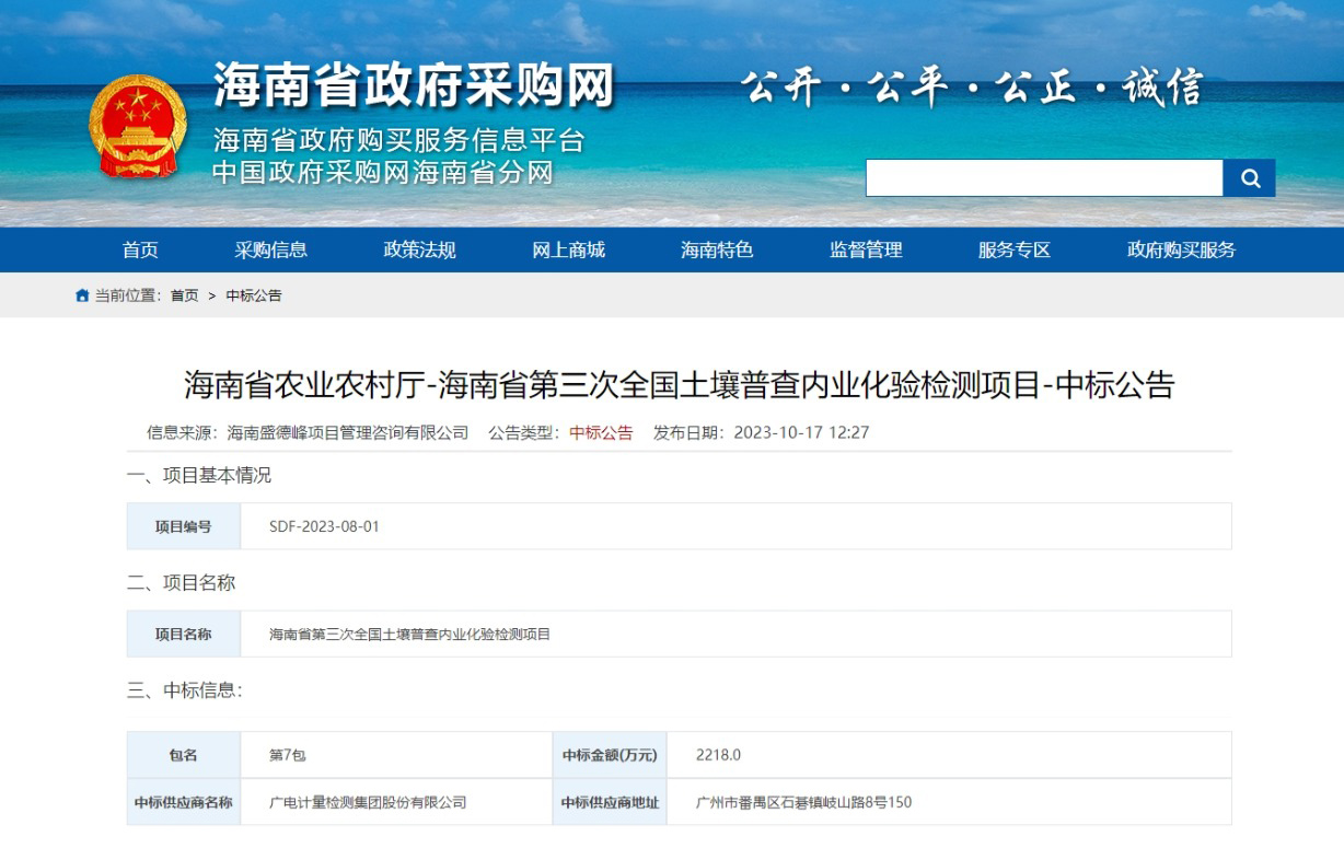 近日,廣電計量中標海南省農業農村廳-海南省第三次全國土壤普查內業化驗檢測項目第7包,項目金額2218萬元,體現了主管部門對公司技術能力、質量管理與服務水平的認可。