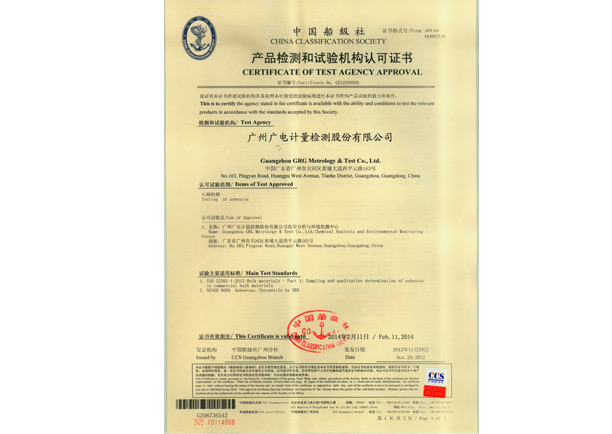 2012年11月29日,廣州廣電計量檢測股份有限公司(GRGT)獲得了由中國船級社(CCS)頒發的石棉檢測檢驗資質認可證書。CCS作為我國的國家船舶技術檢驗機構,技術權威性和公正性得到了國內外船舶行業認可。GRGT作為CCS石棉檢測檢驗認可的第三方專業檢測機構,共同推動中國船舶業的石棉禁用工作,助推中國船舶業“無石棉”綠色健康發展。