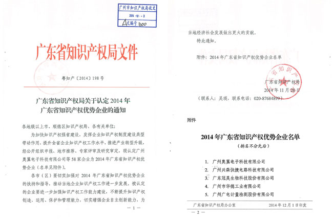 2014年12月3日,GRGT被廣東省知識產權局認定為2014年廣東省知識產權優勢企業。GRGT此次被認定為2014年廣東省知識產權優勢企業意義重大,體現了GRGT知識產權工作建設能力,獲得政府機構的認可,有利于企業自主創新能力快速增強。