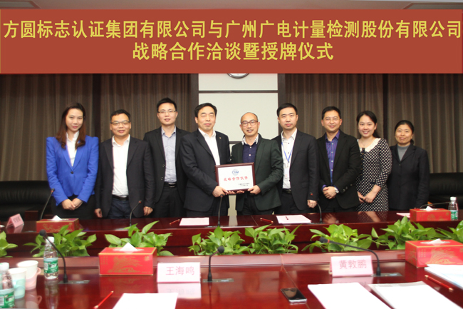 3月16日,GRGT與方圓標志認證集團有限公司戰略合作授牌儀式在廣州總部隆重舉行。方圓認證廣東分公司熊飛彪、張耿彬、陳明東副總經理,GRGT黃敦鵬總經理、劉道云總經理助理等雙方領導參加了戰略合作洽談暨授牌儀式。