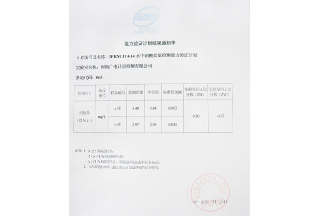 GRGT鄭州檢測基地近期收到環境保護部標準樣品研究所關于“IERM T14-14 水中硝酸鹽氮檢測”能力驗證計劃結果通知單,結果顯示GRGT鄭州檢測基地化學分析實驗室檢測結果全部靠近中位值,成績突出,順利通過本次能力驗證。