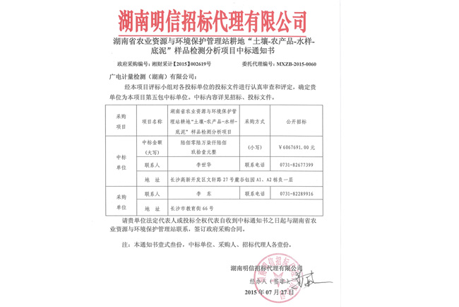 7月27日,GRGT湖南子公司,即廣電計(jì)量檢測(湖南)有限公司收到湖南明信招標(biāo)代理有限公司發(fā)來的《中標(biāo)通知書》,GRGT湖南子公司被確認(rèn)為湖南省農(nóng)業(yè)廳農(nóng)業(yè)資源與環(huán)境保護(hù)管理站耕地 “土壤-農(nóng)產(chǎn)品-水樣-底泥”樣品檢測分析項(xiàng)目(政府采購編號:湘財(cái)采計(jì)【2015】002619號)第五包中標(biāo)單位,涉及樣品總量1.6萬個,總金額606.77萬元,中標(biāo)合同順利簽訂后,GRGT將在長沙縣15個鄉(xiāng)鎮(zhèn)全面展開“土壤-農(nóng)產(chǎn)品-水樣-底泥”樣品檢測分析,為耕地土壤重金屬污染防治提供科學(xué)、準(zhǔn)確、可靠的檢測數(shù)據(jù)和治理建議。