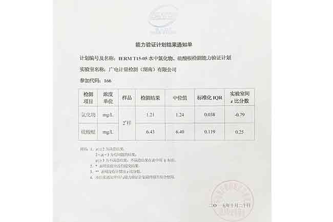 GRGT湖南子公司近期收到環(huán)境保護(hù)部標(biāo)準(zhǔn)樣品研究所關(guān)于“IERM T15-05 水中氯化物、硫酸根檢測(cè)”能力驗(yàn)證計(jì)劃結(jié)果通知單和結(jié)果報(bào)告,結(jié)果顯示GRGT化學(xué)分析測(cè)試中心湖南子公司檢測(cè)結(jié)果的Z比分?jǐn)?shù)絕對(duì)值全部小于0.8,結(jié)果優(yōu)異,順利通過(guò)本次能力驗(yàn)證。