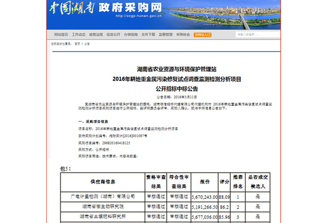 資訊中心公司新聞廣電計量中標湖南省農業廳2016年耕地重金屬污染修復試點調查監測檢測分析項目