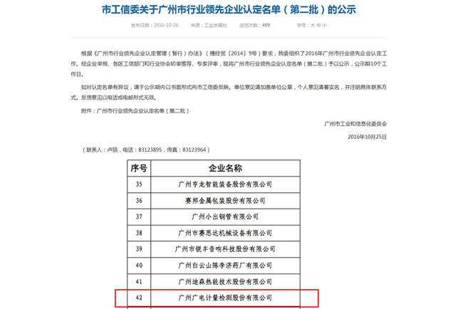 此次被認定為廣州市行業領先企業,充分體現了廣電計量在廣州市質檢技術服務領域的領先地位,其產品服務質量、市場占有率、成長潛力及創新能力均得到了政府部門及專家的認可和肯定。廣電計量將繼續加強企業綜合實力建設,開拓創新的市場化服務模式,發揮行業領先企業的作用,為廣州市及省內外企業提供優質的服務。