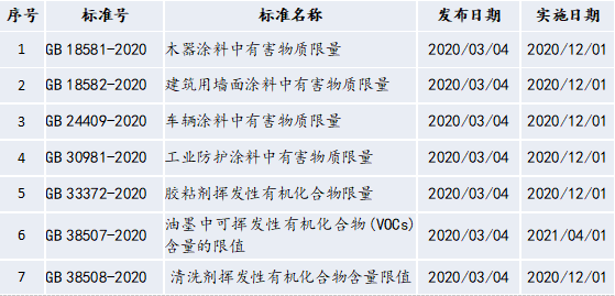 而早在2020年3月4日,國家市場監(jiān)督管理總局(SAMR)、國家標準化管理委員會(SAC)在官網(wǎng)公告中批準發(fā)布了七項涉及涂料、膠粘劑、油墨以及清洗劑VOCs限量的強制性國家標準。截至目前,公告發(fā)布的七項強制性國家標準均已陸續(xù)正式實施。正式實施后的七項標準既作為市場監(jiān)督管理部門組織監(jiān)督抽查的依據(jù),也被作為生態(tài)環(huán)境部實施企業(yè)VOCs管控的依據(jù)。