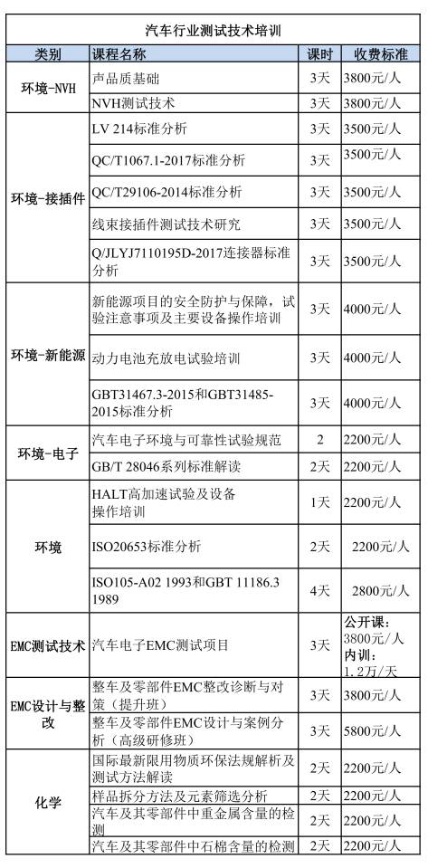 課程體系主要涵蓋:汽車行業的環境可靠性檢驗技術(包括:環境-NVH、環境-接插件、環境-電子等)、EMC檢測(包括:EMC測試技術、EMC設計基整改等)、化學檢測等多個類別。