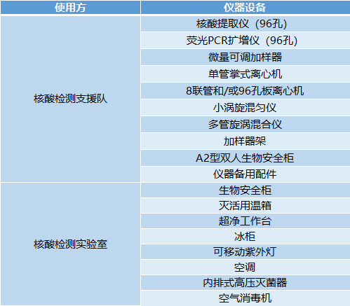 實施指南中“核酸檢測支援隊有關要求”和“核酸檢測實驗室儲備及保障”條例中對實驗室和檢測設備的配備都做了明確要求,其中核酸檢測支援隊要求所需物資應當單獨配備,各城市根據人口數量需配置不同規格的實驗室并儲備相關檢測設備。