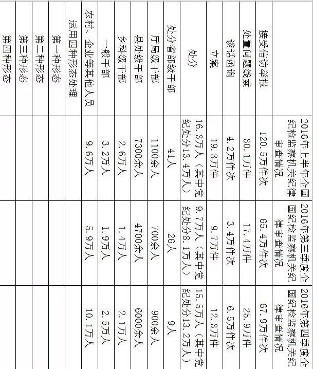 從2016年8月11日起,中紀委網站公布2016年上半年全國紀檢監察機關紀律審查情況,此后每季度均會向社會公布會全國紀檢監察機關接受信訪舉報、處置問題線索、談話函詢、立案、處分的數量,以及處分的省部級干部、廳局級干部、縣處級干部、鄉科級干部、一般干部以及農村、企業等其他人員的數量。從2017年第一季度起,通報還增加了全國紀檢監察機關運用監督執紀“四種形態”處理人員的數量,并對第一、二、三、四種形態處理人次和占比均進行了公布。對此,我們作了一個簡單的梳理,可以基本分析出2016年以來每個季度的相關數據(見下表)。