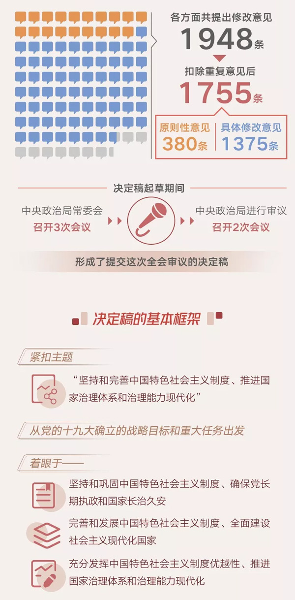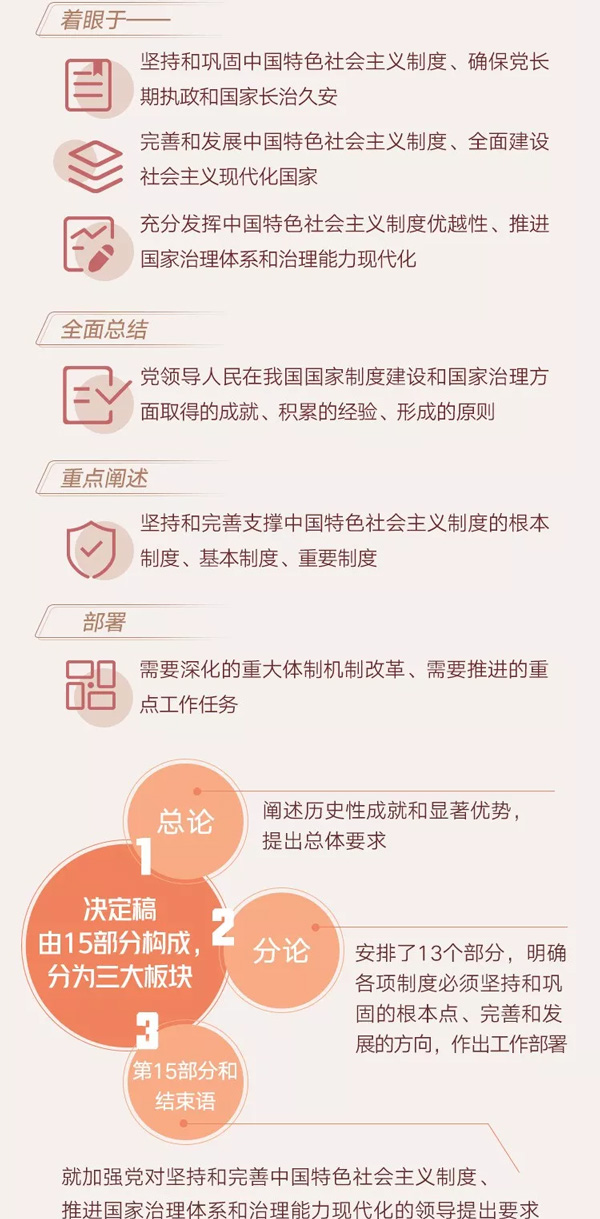 決定稿總體考慮是,緊扣“堅持和完善中國特色社會主義制度、推進國家治理體系和治理能力現代化”這個主題,從黨的十九大確立的戰略目標和重大任務出發,著眼于堅持和鞏固中國特色社會主義制度、確保黨長期執政和國家長治久安,著眼于完善和發展中國特色社會主義制度、全面建設社會主義現代化國家,著眼于充分發揮中國特色社會主義制度優越性、推進國家治理體系和治理能力現代化,全面總結黨領導人民在我國國家制度建設和國家治理方面取得的成就、積累的經驗、形成的原則,重點闡述堅持和完善支撐中國特色社會主義制度的根本制度、基本制度、重要制度,部署需要深化的重大體制機制改革、需要推進的重點工作任務。