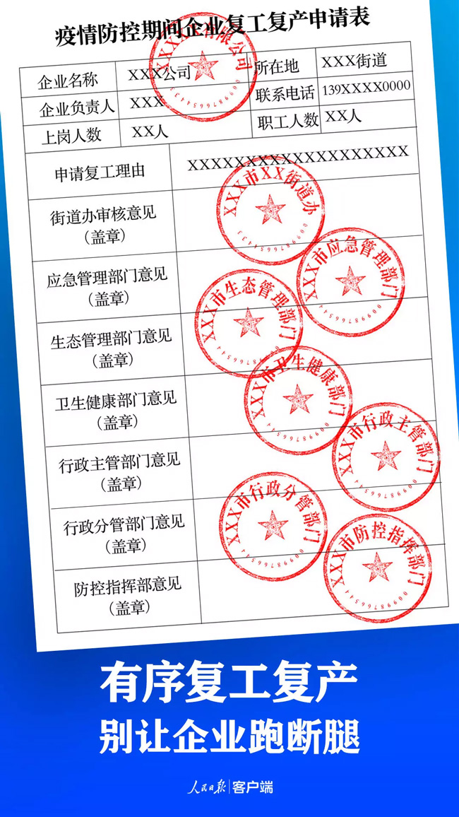 七八個部門審核、蓋九個章、多名分管領導簽字……近日,一張復工申請表在網上流傳,引起輿論關注。近來,類似情況屢見不鮮,更有甚者,企業(yè)在被層層審核之后,復工復產卻仍遙遙無期。