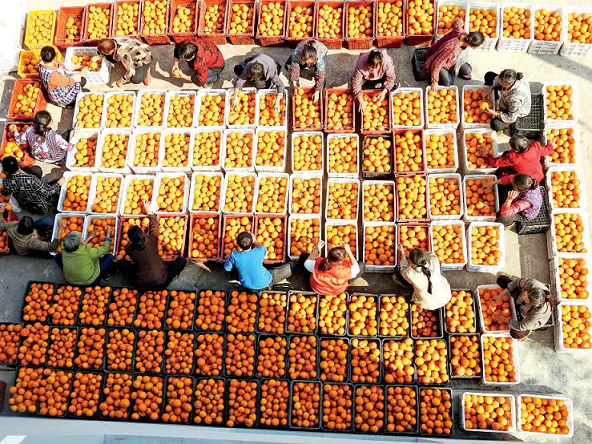 在四川達州市金埡鎮金山村,“扶貧車間”富峰黨員家庭農場種植的臍橙喜獲豐收。