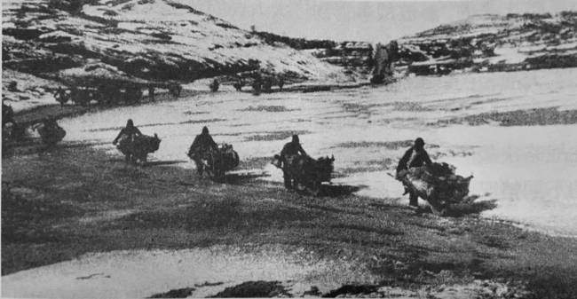 三大戰役期間,解放區農民在冰天雪地中用小車把彈藥、物資運往前線。圖片來源:《中國共產黨的九十年》