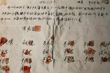 1978年12月的一個冬夜,安徽省鳳陽縣小崗村18位村民以敢為天下先的勇氣,在一紙分田到戶的“秘密契約”上按下鮮紅的手印:“我們分田到戶,每戶戶主簽字蓋章,如以后能干,每戶保證完成每戶的全年上交和公糧,不在(再)向國家伸手要錢要糧。如不成,我們干部作(坐)牢殺頭也干(甘)心,大家社員也保證把我們的小孩養活到十八歲。”