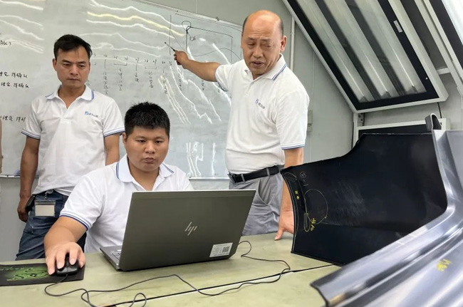 這是古顯善(右一)與技術(shù)團(tuán)隊(duì)討論模具制作圖調(diào)整方案。新華社記者趙瑞希 攝