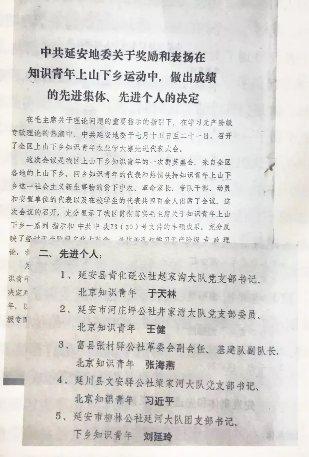 延安地委表彰上山下鄉運動中的先進集體和個人,其中就有時任梁家河大隊黨支部書記習近平。(來源:央廣網)