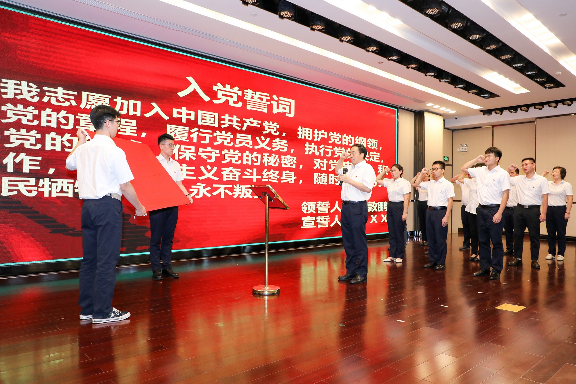 會議舉行了莊嚴的入黨宣誓儀式,在全體黨員的見證下,老黨員為新黨員代表佩戴黨員徽章。在黃敦鵬的帶領下,總部新黨員上臺宣誓,全體黨員起立重溫入黨誓詞。